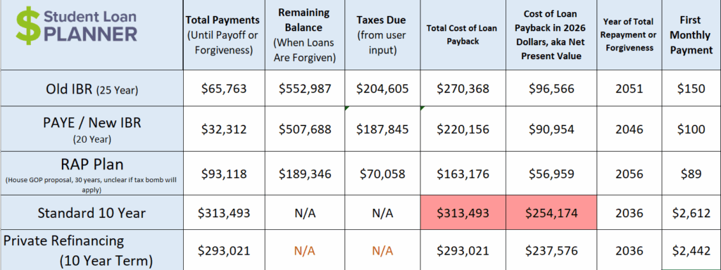 It’s difficult to look at the total cost column and make judgments without thinking about the cost of each path in today’s dollars. After all, these repayment periods are over different loan terms, and we need to adjust for alternatives where you could invest your money.