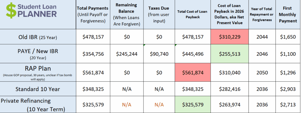 By maxing out his retirement, he lowers his AGI to $155,500. Here are his repayment options for PAYE vs. IBR. We've also added refinancing for comparison.