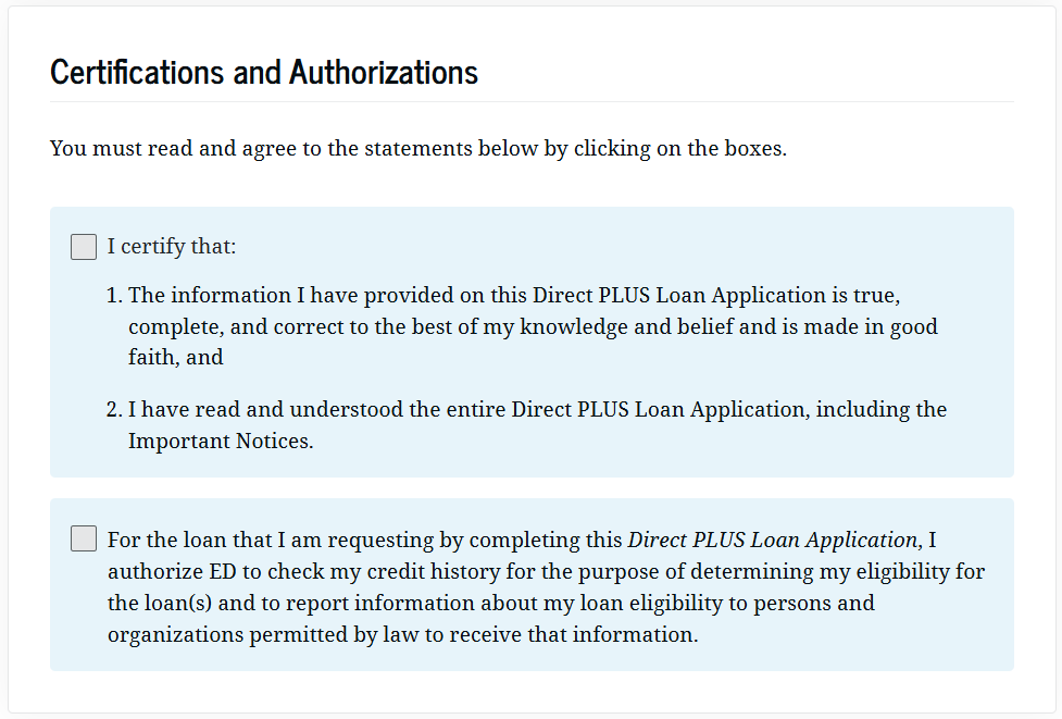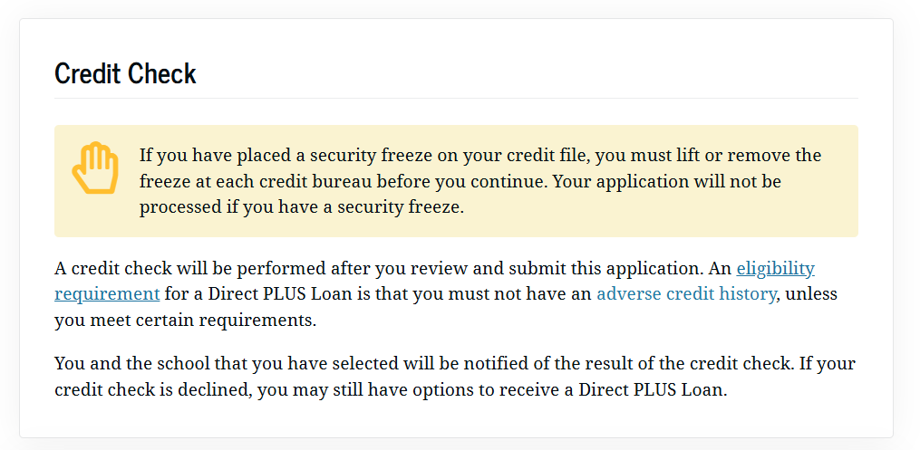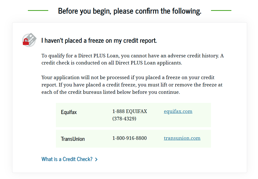 You’ll need to allow the U.S. Department of Education to run a credit check. Be sure you don’t have a freeze on your credit report before you click this approval.