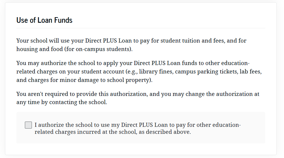 The next step will ask for loan information, including the amount you're requesting, loan period and authorization for the school to apply the Grad PLUS Loan for other education-related charges on your student account (e.g., library fines, parking tickets, etc.). Note you aren't required to provide this authorization and you can change it any time by contacting the school.