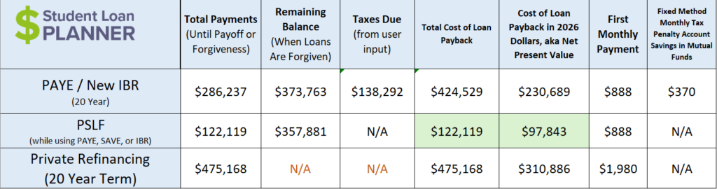 With PSLF, you can earn forgiveness twice as fast (in as little as 10 years), and you won't pay taxes on the forgiven loan balance. Using the previous example, PSLF results in substantial savings, with total costs of about $122,000 compared to $475,000 with refinancing — a difference of roughly $353,000. When you look at the cost in today’s dollars, the savings are even greater, at over $213,000 less in net present value.